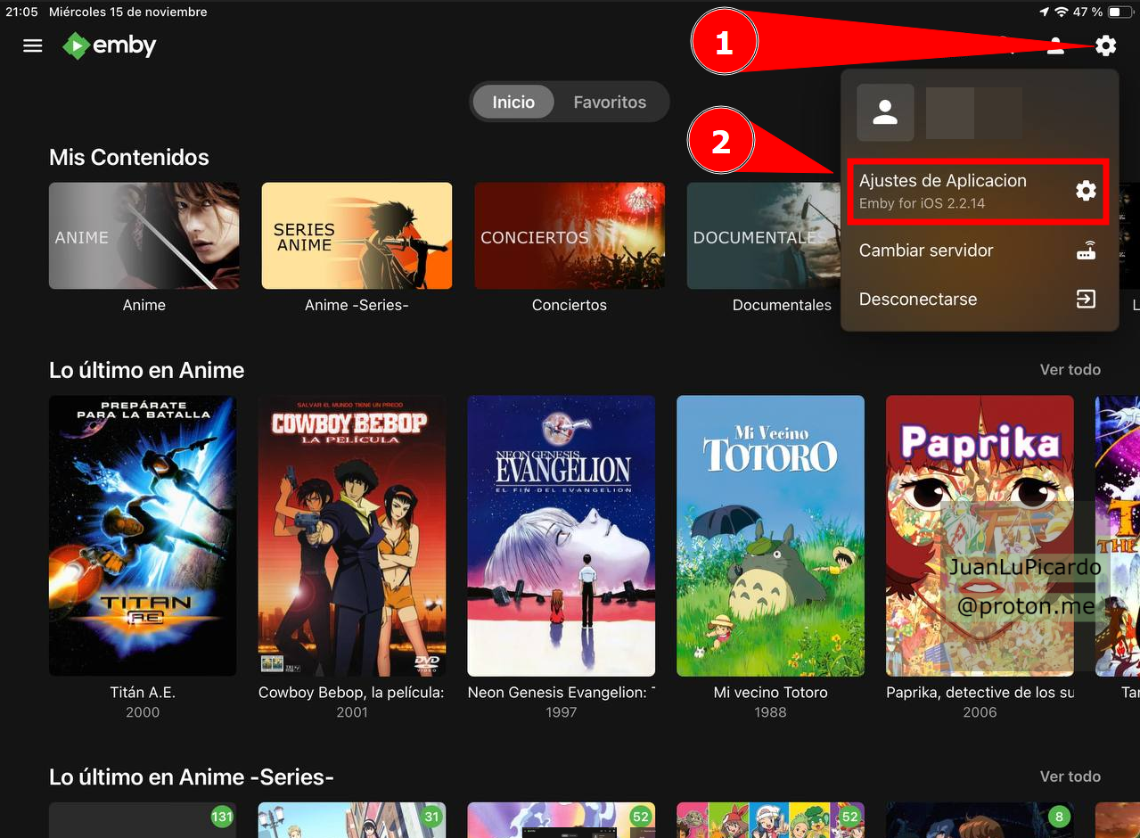 1.- Nos dirigimos a la rueda dentada, arriba a la derecha, y 2.- Hacemos clic en “Ajustes de Aplicación”: