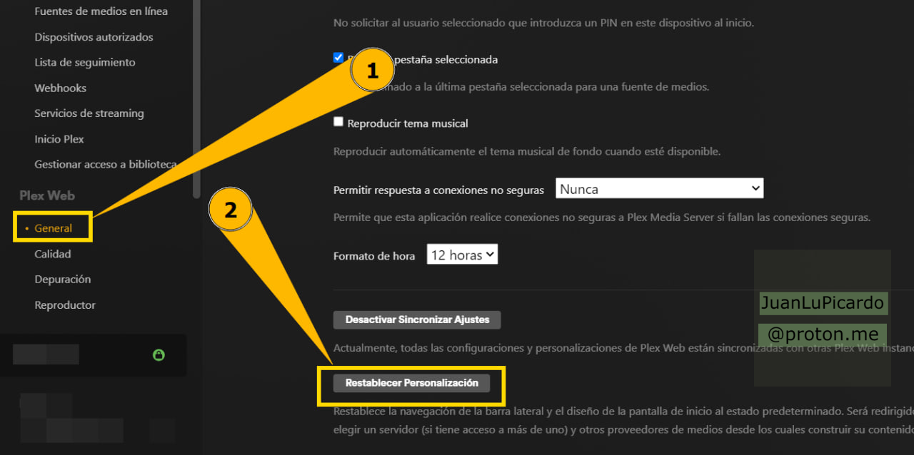 * Vamos a Plex Web –> General, y hacemos click en restablecer personalización: